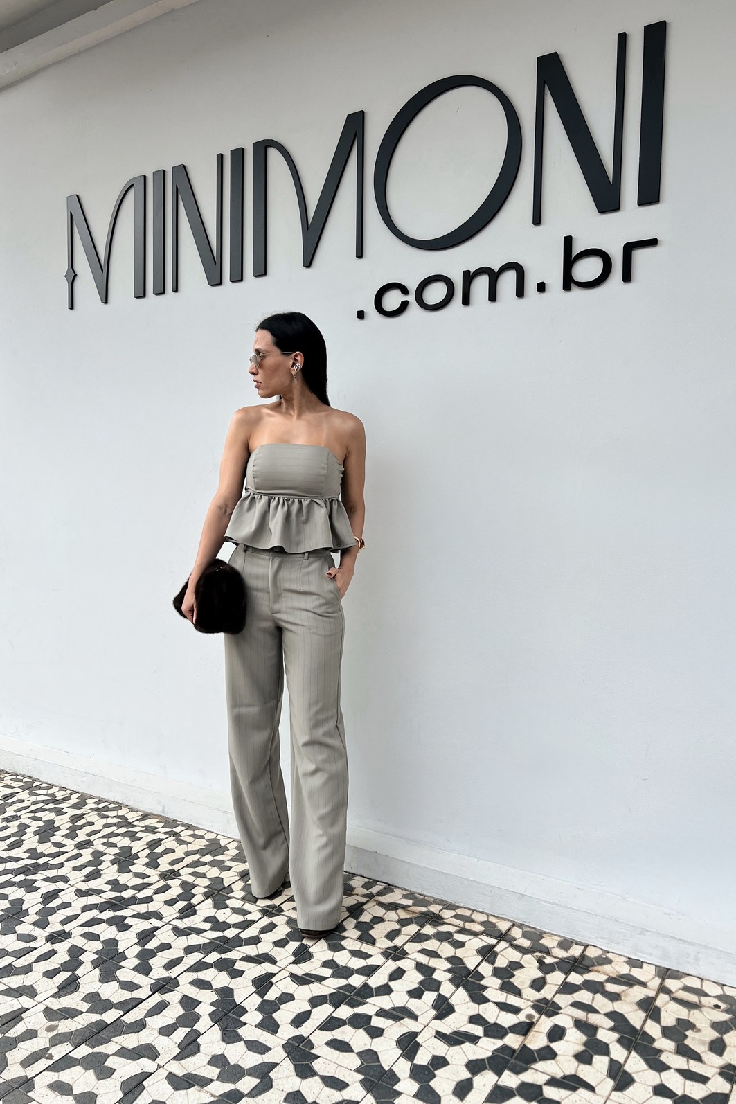 Calça de Alfaiataria Lavinia – MiniMoni, uma peça de alfaiataria cinza com riscas de giz pretas que entrega presença de look, mas com uma estética minimalista e sofisticada.
