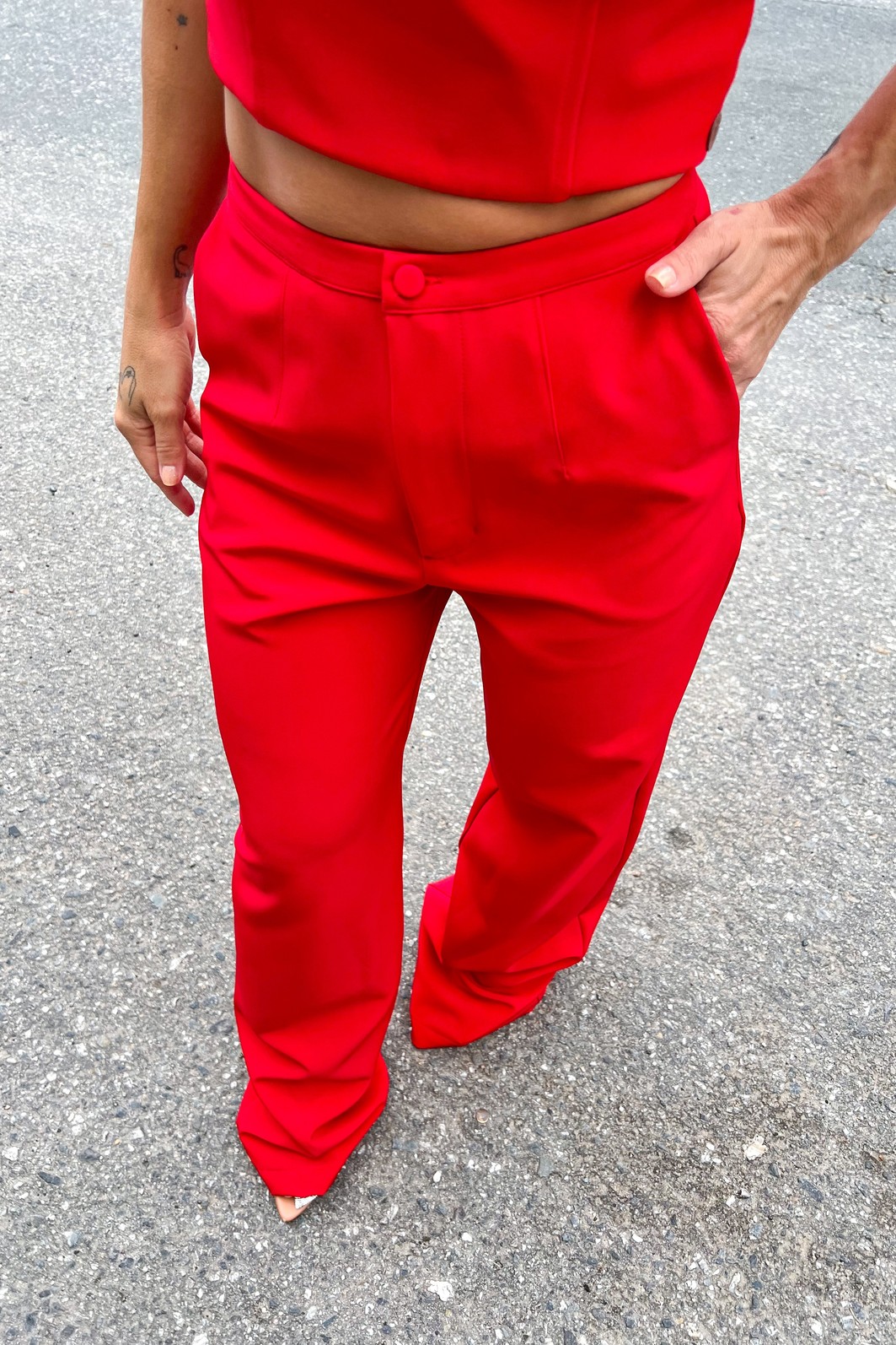 AdicionarA Calça Alfaiataria Vermelha Sienna – MiniMoni apresenta-se como uma peça essencial sofisticada que oferece elegância com estilo alfaiataria minimalista, calça ampla solta, bolsos laterais funcionais, botão revestido branco, cós fino minimalista, transmitindo elegância atemporal, e feminilidade sofisticada . O tecido 90% Poliéster, 10% Elastano.