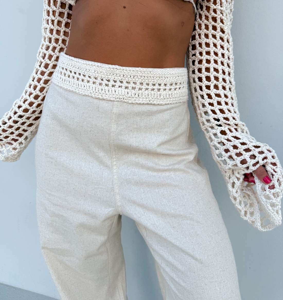 Calça de Linho Cós Detalhe em Crochê – MiniMoni