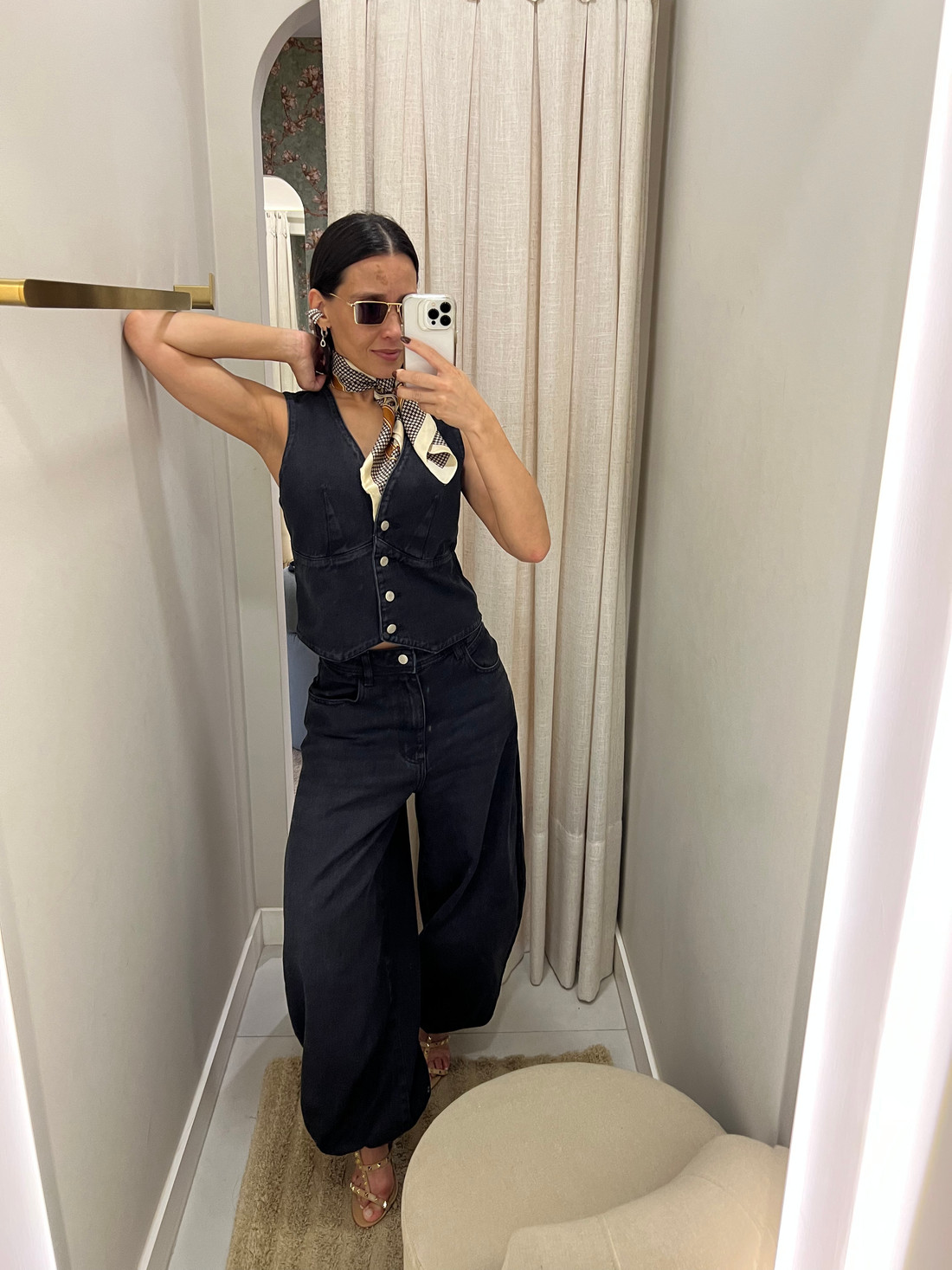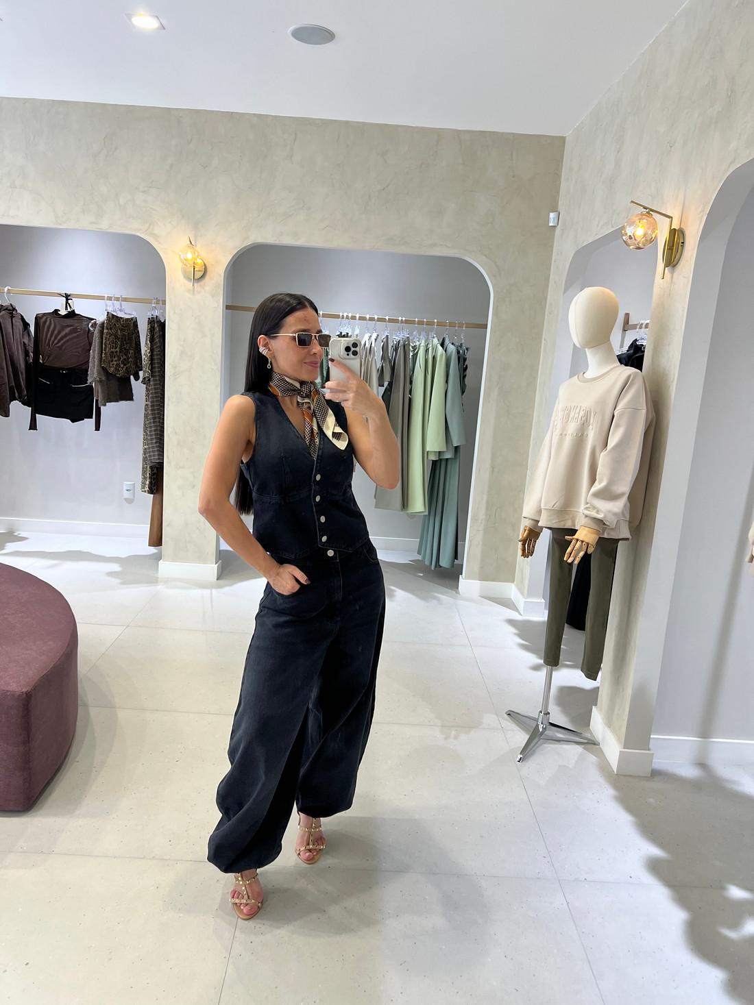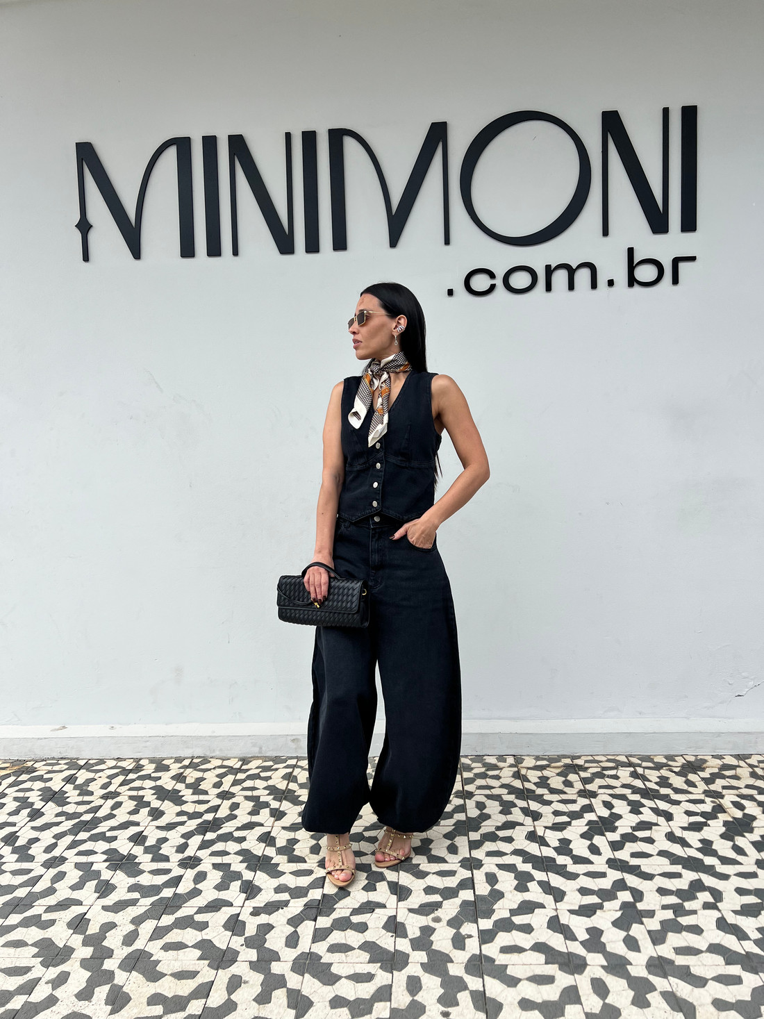 Apresentamos o colete denim preto Amanda da MiniMoni — uma peça curinga que combina estilo urbano e versatilidade para diversas ocasiões.