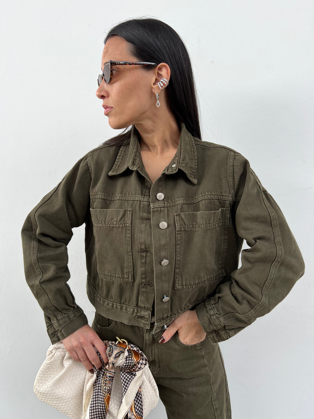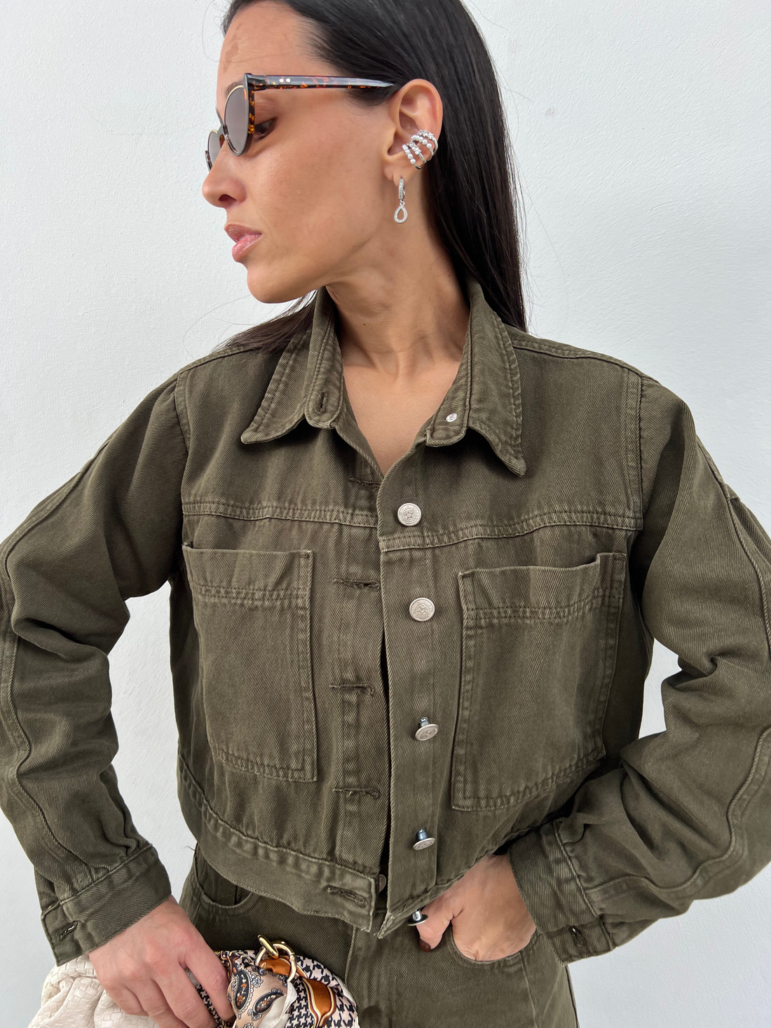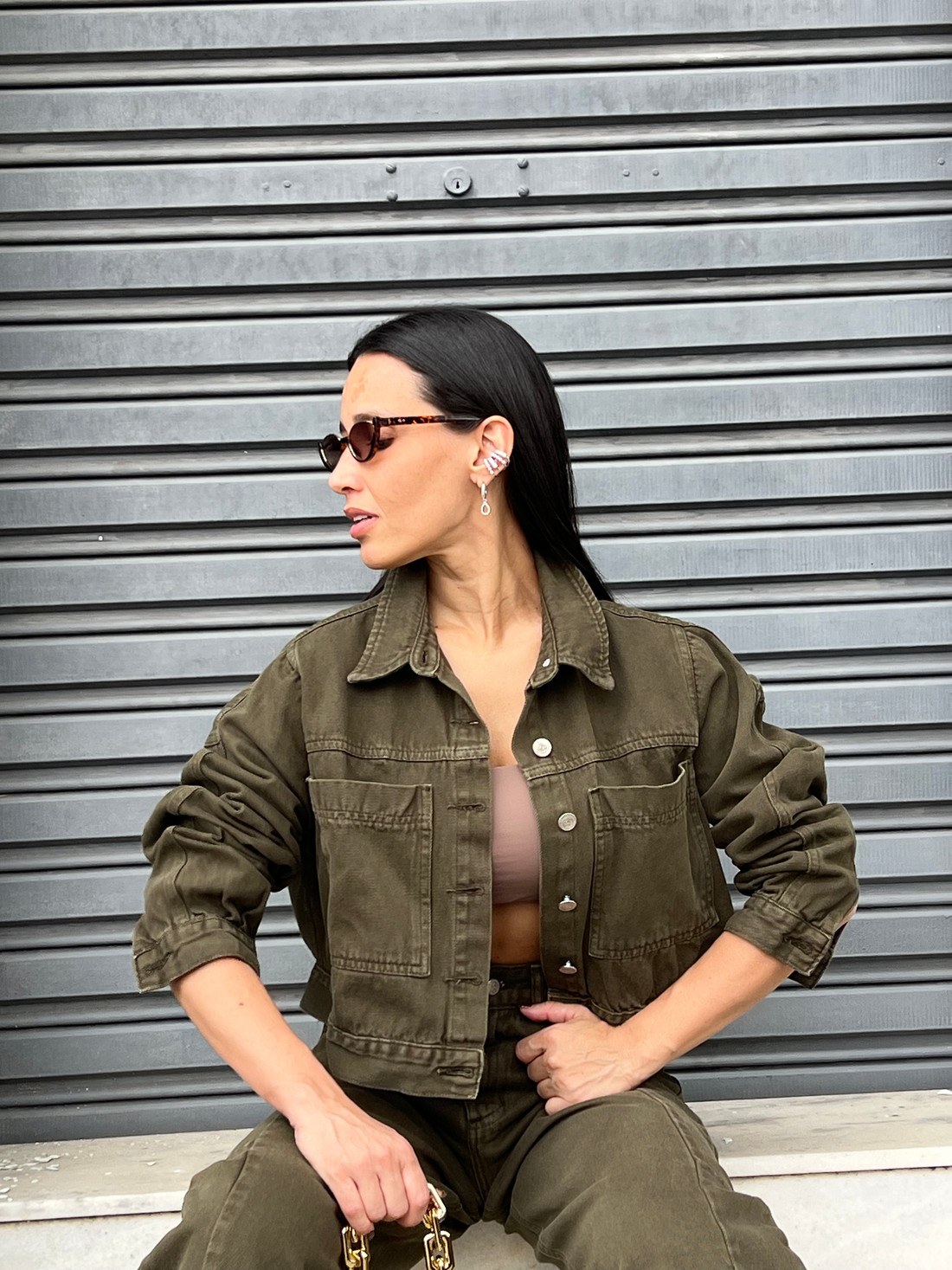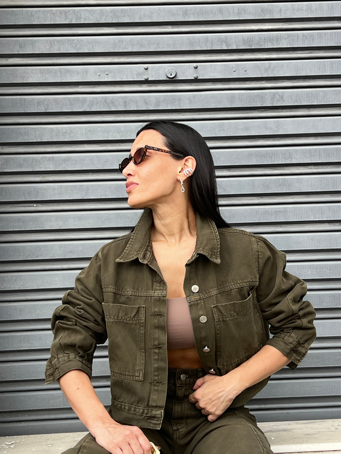 A Jaqueta Jeans Verde Militar Aryna da MiniMoni é a peça statement que faltava no seu guarda-roupa! Com design inspirado na estética utilitária e militar e um toque urbano, ela combina versatilidade, estilo e conforto para diversas ocasiões — desde looks casuais do dia a dia até composições mais ousadas para a noite.