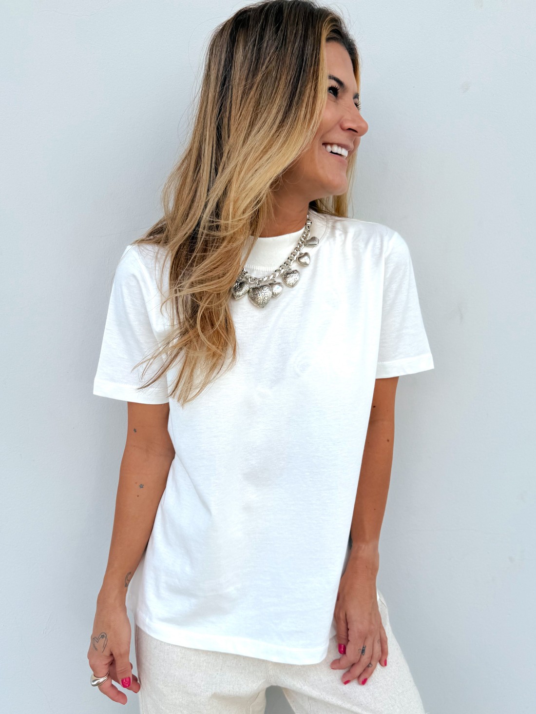 Com uma modelagem simples, mas cuidadosamente ajustada, a t-shirt proporciona um caimento impecável e versátil. Seja para um dia de trabalho, uma saída casual ou até mesmo uma produção mais elaborada, esta peça se adapta perfeitamente a qualquer situação. Combine-a com jeans para um visual descontraído, ou com saias midi e calças de alfaiataria para um look mais sofisticado.