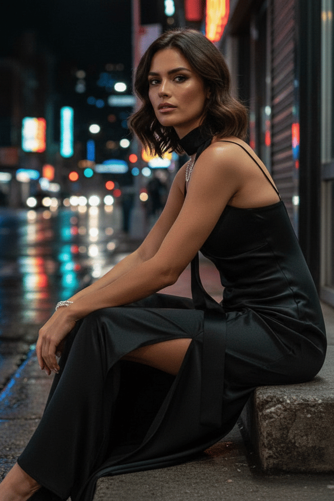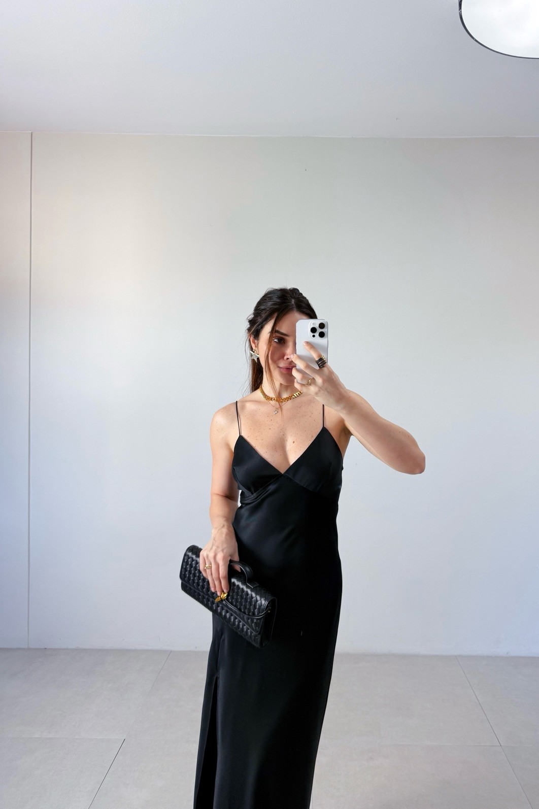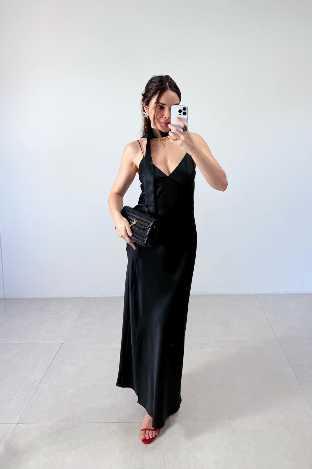 O detalhe que faz diferença? A fenda lateral sofisticada que adiciona movimento visual elegante e feminilidade genuína, enquanto a faixa acompanhada oferece versatilidade de uso e ajuste personalizado para criar diferentes produções. O brilho acetinado luxuoso captura luz com sofisticação premium, enquanto o caimento estruturado mas fluido acompanha seu corpo naturalmente, define silhueta sem apertar. A cor preto profundo é elegância atemporal (combinação clássica). Este é o vestido que você coloca e sente-se imediatamente elegante, confiante e pronta para impressionar.